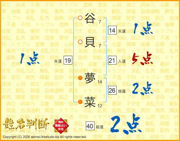 谷(7画)貝(7画) 夢(14画)菜(12画)