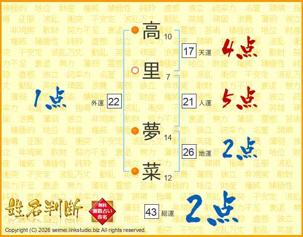 高里夢菜さんの総運は43画の2点!