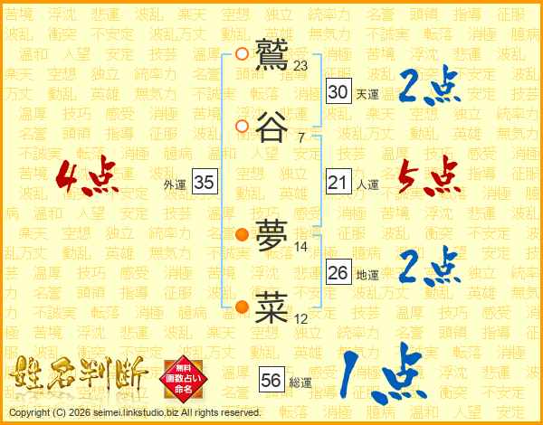 鷲(23画)谷(7画) 夢(14画)菜(12画)