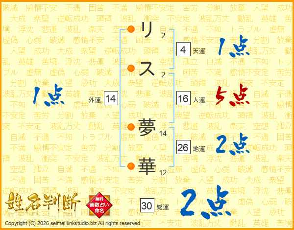 リ(2画)ス(2画) 夢(14画)華(12画)