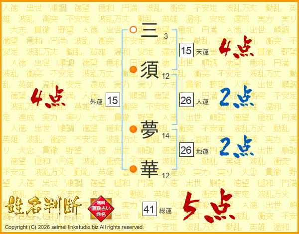 家系が持つ宿命的な運勢を表します。祖先から受け継いだ苗字ですので自分の力が及びません。家柄を象徴します。苗字の合計画数。