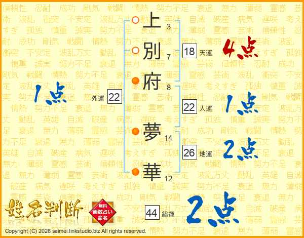 上(3画)別(7画)府(8画) 夢(14画)華(12画)