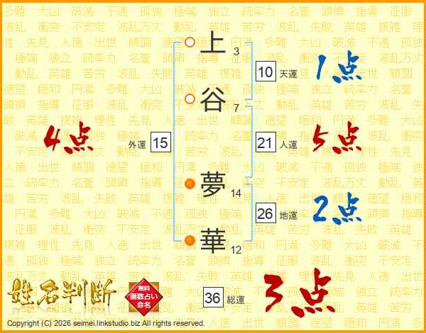 上(3画)谷(7画) 夢(14画)華(12画)