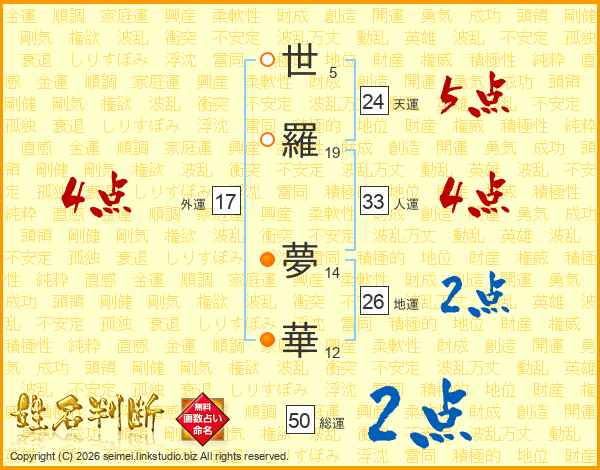 生活面を象徴する運勢です。外部から受ける影響力を表し、結婚運、家庭運や職場、環境への順応性を表します。総運から人運を引いた画数。姓や名が1文字の場合を除く。