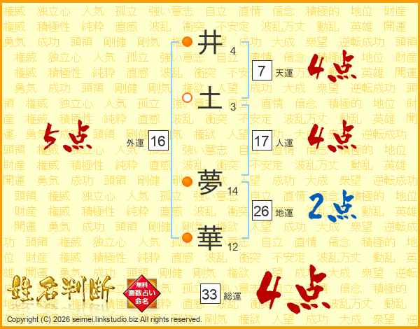 生活面を象徴する運勢です。外部から受ける影響力を表し、結婚運、家庭運や職場、環境への順応性を表します。総運から人運を引いた画数。姓や名が1文字の場合を除く。