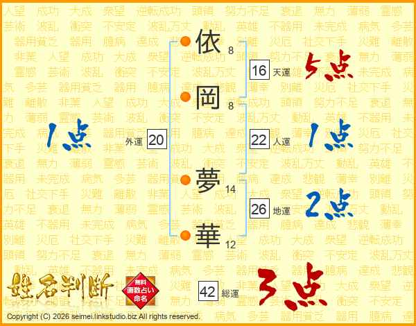 生活面を象徴する運勢です。外部から受ける影響力を表し、結婚運、家庭運や職場、環境への順応性を表します。総運から人運を引いた画数。姓や名が1文字の場合を除く。