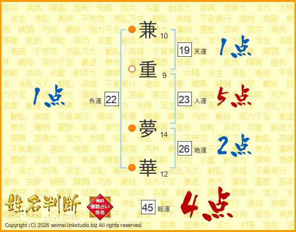 家系が持つ宿命的な運勢を表します。祖先から受け継いだ苗字ですので自分の力が及びません。家柄を象徴します。苗字の合計画数。