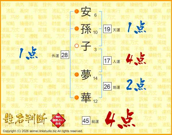 安(6画)孫(10画)子(3画) 夢(14画)華(12画)