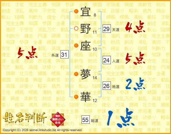 宜(8画)野(11画)座(10画) 夢(14画)華(12画)