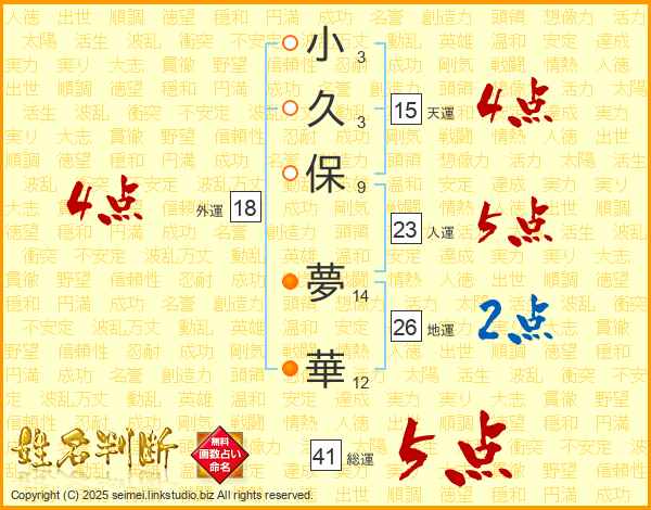小(3画)久(3画)保(9画) 夢(14画)華(12画)