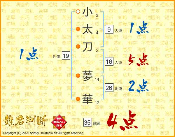 小(3画)太(4画)刀(2画) 夢(14画)華(12画)