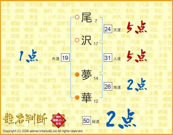 尾沢夢華さんの総運は50画の2点!