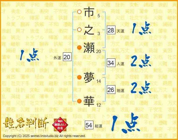 市(5画)之(3画)瀬(20画) 夢(14画)華(12画)