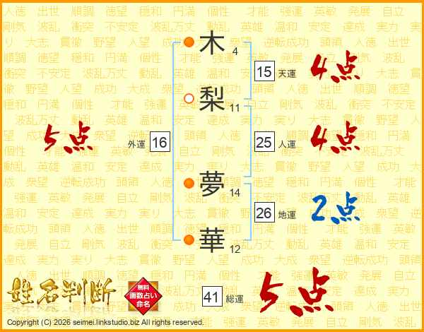 木(4画)梨(11画) 夢(14画)華(12画)