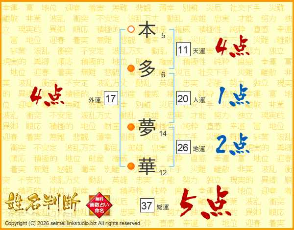本多夢華さんの総運は37画の5点!