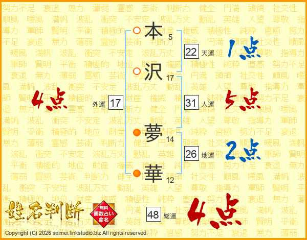 本沢夢華さんの人運は31画の5点!