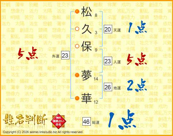 松(8画)久(3画)保(9画) 夢(14画)華(12画)