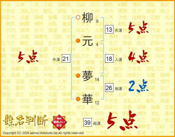 柳(9画)元(4画) 夢(14画)華(12画)