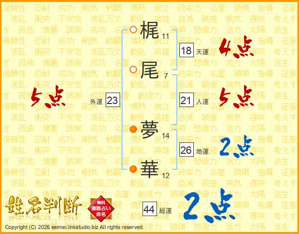 梶(11画)尾(7画) 夢(14画)華(12画)