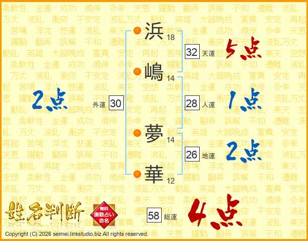 浜(18画)嶋(14画) 夢(14画)華(12画)