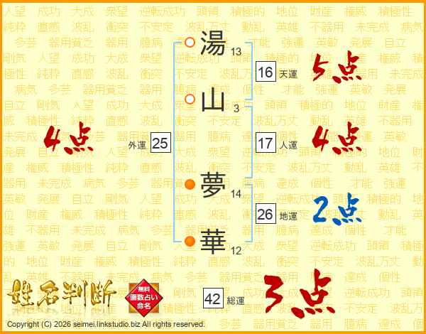 湯(13画)山(3画) 夢(14画)華(12画)
