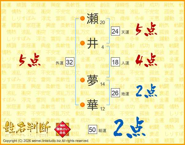瀬(20画)井(4画) 夢(14画)華(12画)