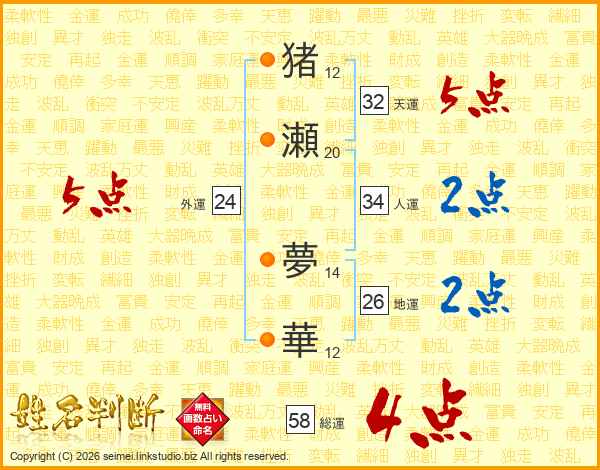 猪(12画)瀬(20画) 夢(14画)華(12画)
