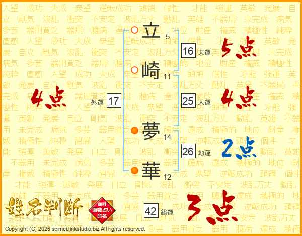 生活面を象徴する運勢です。外部から受ける影響力を表し、結婚運、家庭運や職場、環境への順応性を表します。総運から人運を引いた画数。姓や名が1文字の場合を除く。