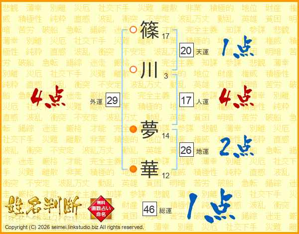生活面を象徴する運勢です。外部から受ける影響力を表し、結婚運、家庭運や職場、環境への順応性を表します。総運から人運を引いた画数。姓や名が1文字の場合を除く。