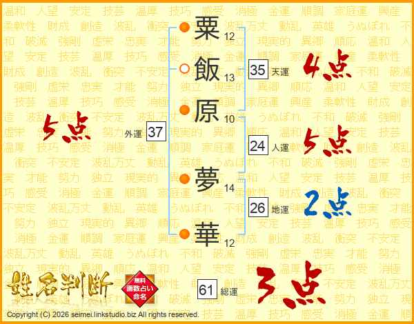 粟(12画)飯(13画)原(10画) 夢(14画)華(12画)