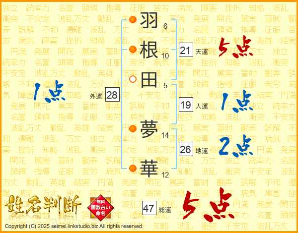 羽(6画)根(10画)田(5画) 夢(14画)華(12画)
