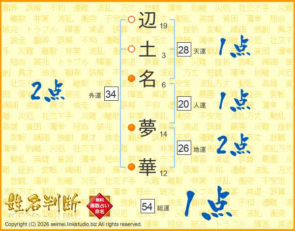 辺(19画)土(3画)名(6画) 夢(14画)華(12画)