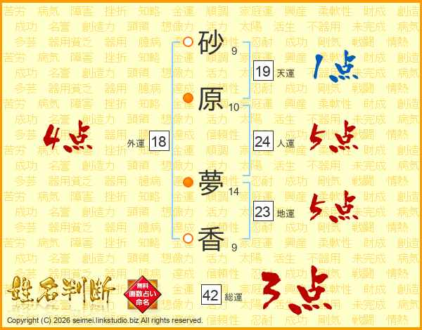 生活面を象徴する運勢です。外部から受ける影響力を表し、結婚運、家庭運や職場、環境への順応性を表します。総運から人運を引いた画数。姓や名が1文字の場合を除く。