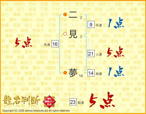 生活面を象徴する運勢です。外部から受ける影響力を表し、結婚運、家庭運や職場、環境への順応性を表します。総運から人運を引いた画数。姓や名が1文字の場合を除く。