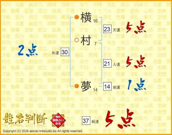 横村夢さんの総運は37画の5点!