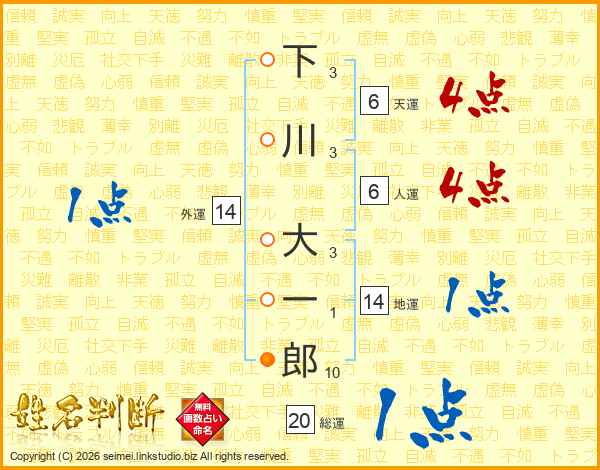 下(3画)川(3画) 大(3画)一(1画)郎(10画)
