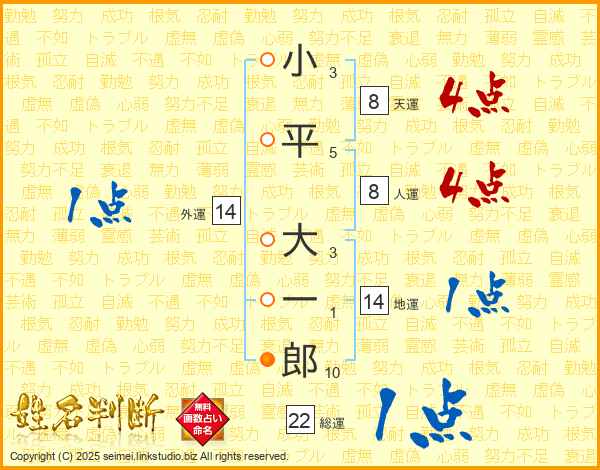 生活面を象徴する運勢です。外部から受ける影響力を表し、結婚運、家庭運や職場、環境への順応性を表します。総運から人運を引いた画数。姓や名が1文字の場合を除く。