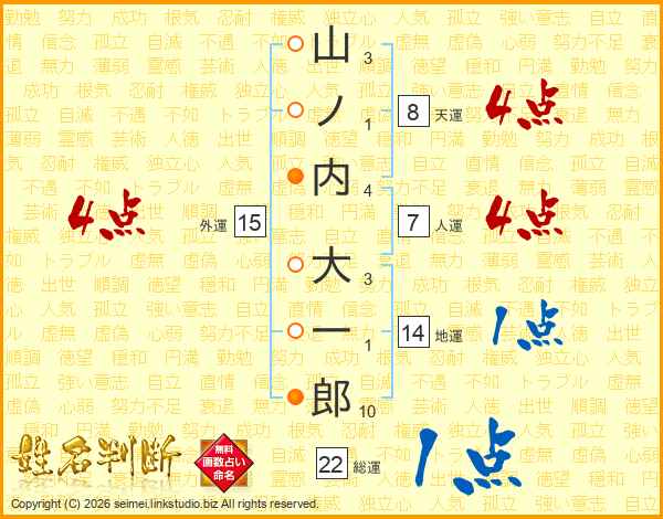 山(3画)ノ(1画)内(4画) 大(3画)一(1画)郎(10画)