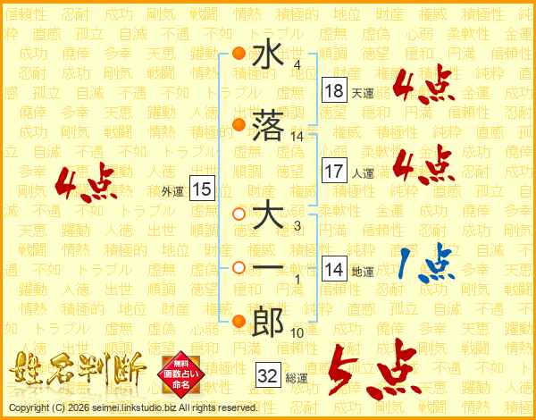 水(4画)落(14画) 大(3画)一(1画)郎(10画)
