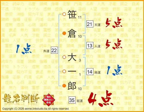 笹(11画)倉(10画) 大(3画)一(1画)郎(10画)