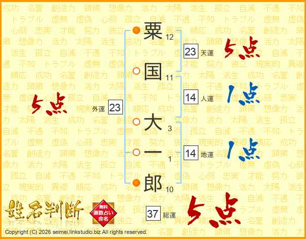 粟(12画)国(11画) 大(3画)一(1画)郎(10画)