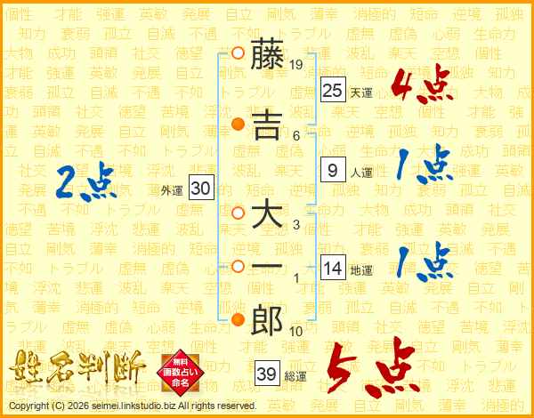 藤(19画)吉(6画) 大(3画)一(1画)郎(10画)