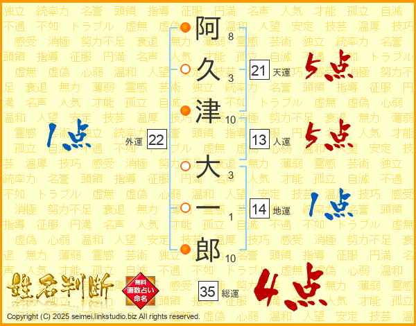 阿(8画)久(3画)津(10画) 大(3画)一(1画)郎(10画)