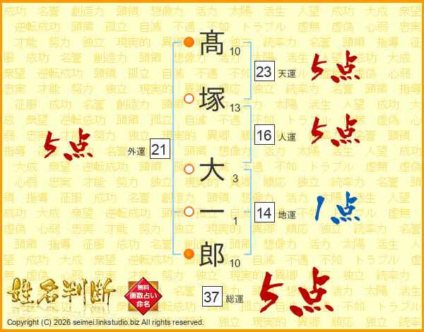髙(10画)塚(13画) 大(3画)一(1画)郎(10画)
