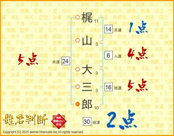 梶(11画)山(3画) 大(3画)三(3画)郎(10画)