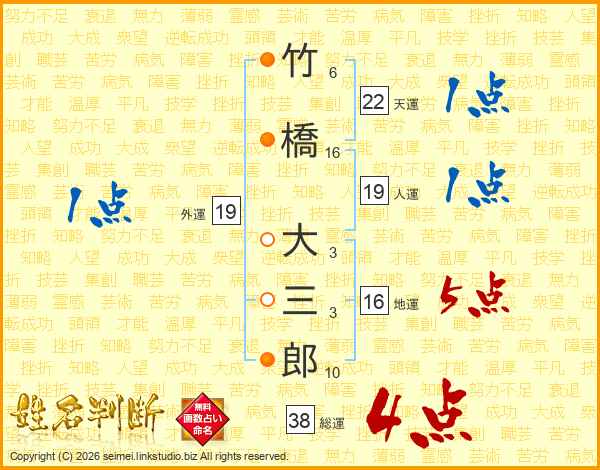 竹(6画)橋(16画) 大(3画)三(3画)郎(10画)