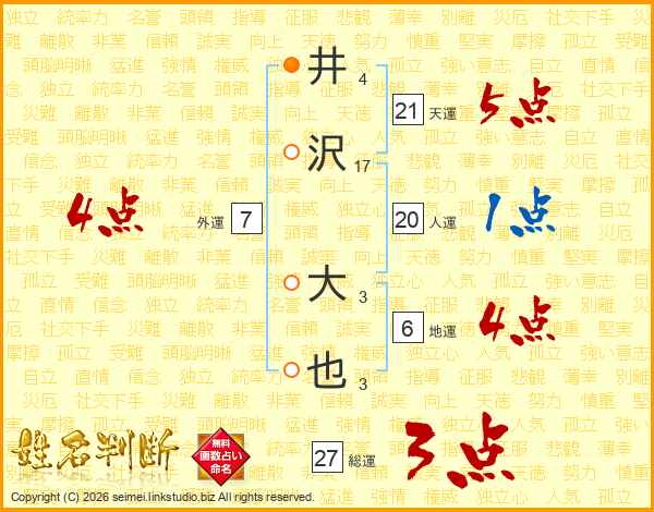 生活面を象徴する運勢です。外部から受ける影響力を表し、結婚運、家庭運や職場、環境への順応性を表します。総運から人運を引いた画数。姓や名が1文字の場合を除く。