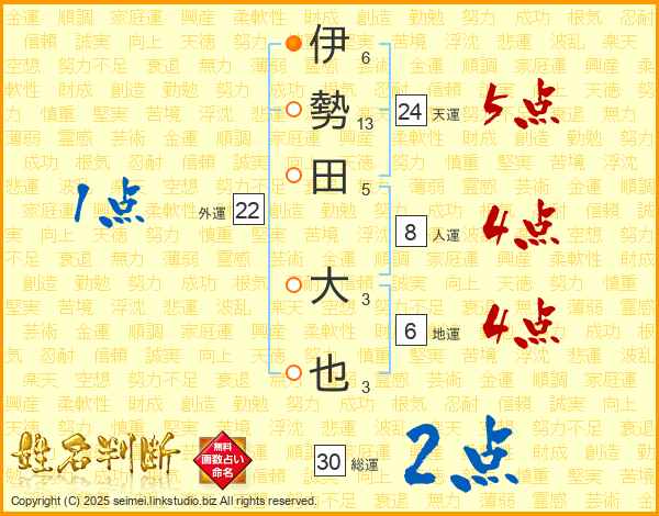 伊(6画)勢(13画)田(5画) 大(3画)也(3画)