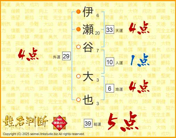 伊(6画)瀬(20画)谷(7画) 大(3画)也(3画)
