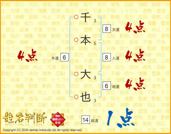 生活面を象徴する運勢です。外部から受ける影響力を表し、結婚運、家庭運や職場、環境への順応性を表します。総運から人運を引いた画数。姓や名が1文字の場合を除く。